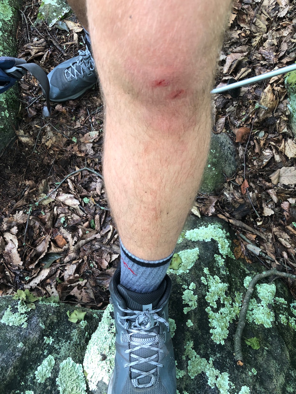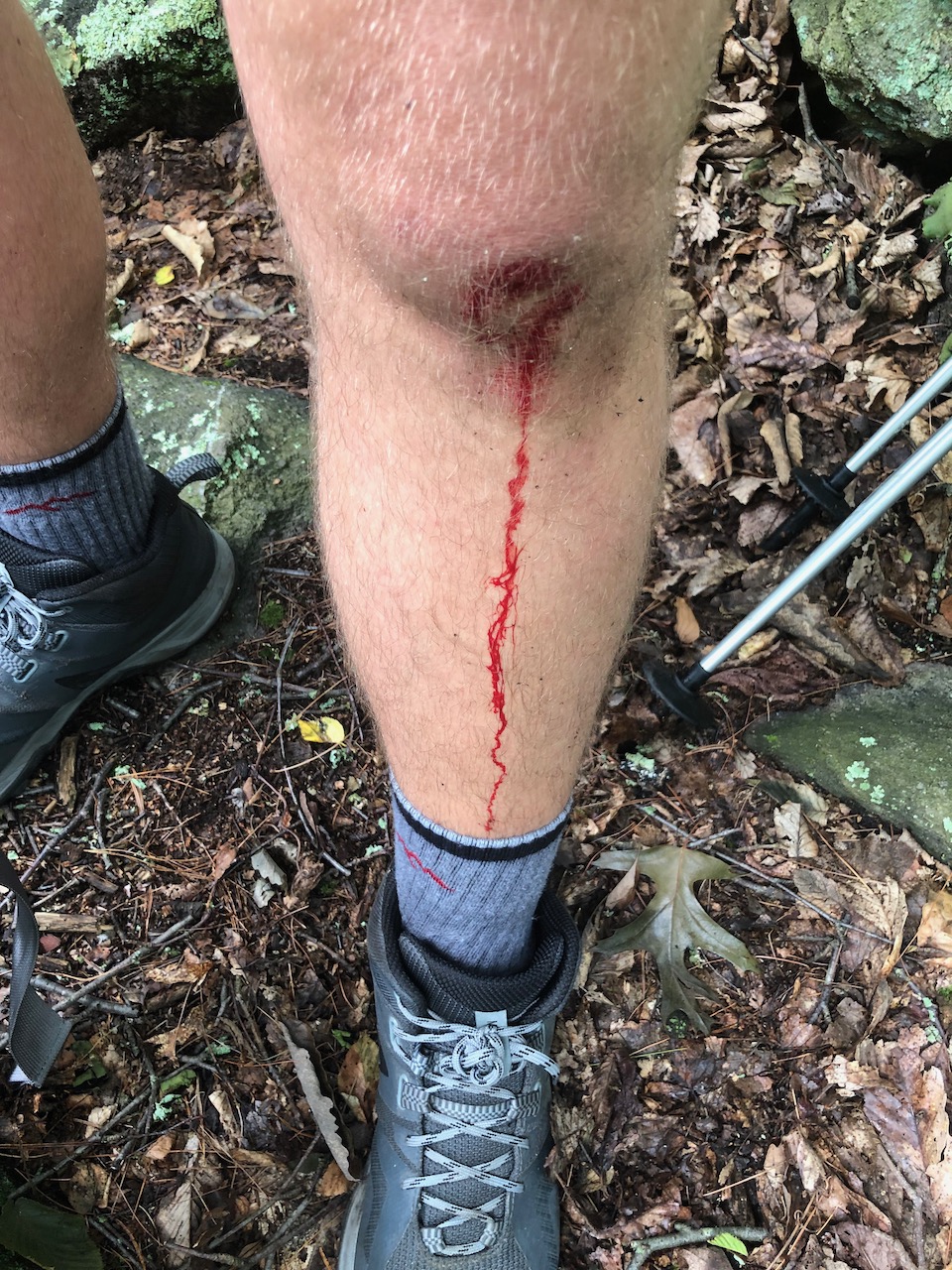 I made my way carefully through the rocks—well as carefully as I could, which wasn't careful enough. I stepped on a rock and my foot slipped, the rock slick from the humidity. My left knee smashed down on the rock, pain jolting through my leg. When I got up, blood ran down my shin. I set my pack down, took a photo (of course), and got my first-aid kit out. Thank goodness for the first-aid kit. I disinfected the wound, wiped up the blood, and tried to apply a bandage with tape. The bandage and tape wanted to do anything other than stay on my knee, but the blood had stopped running, so I let the blood clot without any assistance.