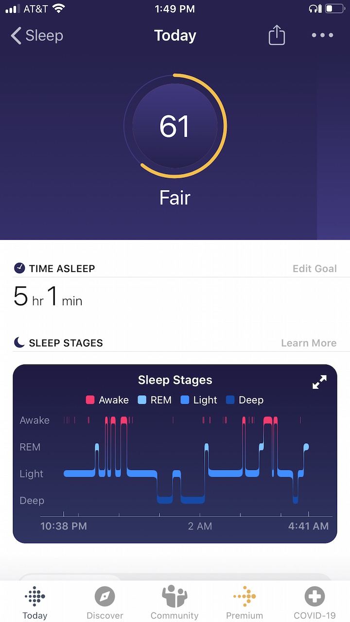 According to my sleep tracking watch, I got five hours of "Fair" sleep.
